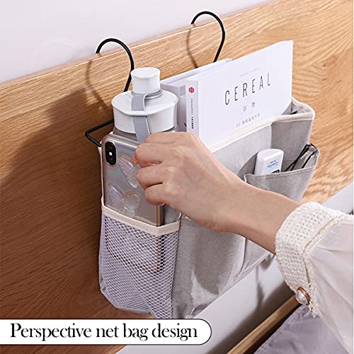 - [Large Capacity] The bedside hanging basket has 1 large pocket and 2 small pockets. The left side is a mesh bag, and the right side is equipped with two hooks. It has a large storage space, and it is easy to store items without taking up space.