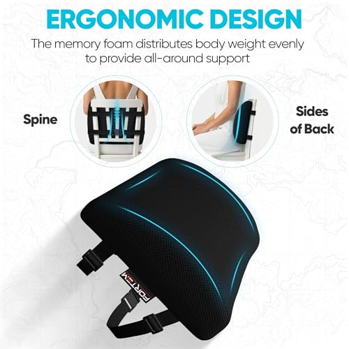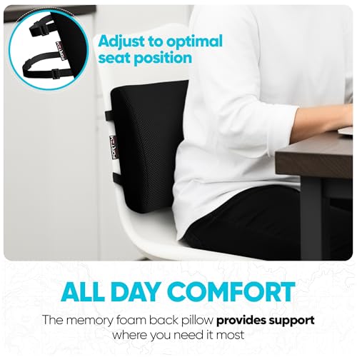 - JUST RIGHT – Crafted from premium memory foam, this cushion delivers the ideal balance of firmness, making it perfect for any setting. Whether you're using it as lumbar support for office chair or while driving, its ergonomic design fits seamlessly against your back, ensuring hours of dependable chair back support.