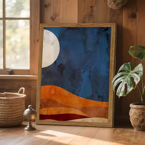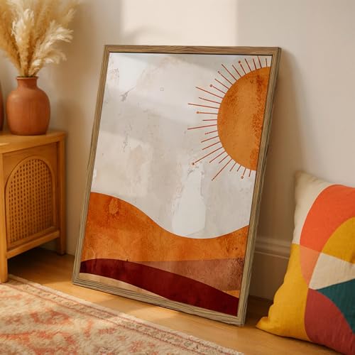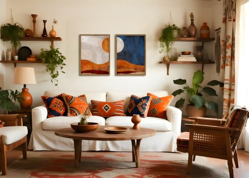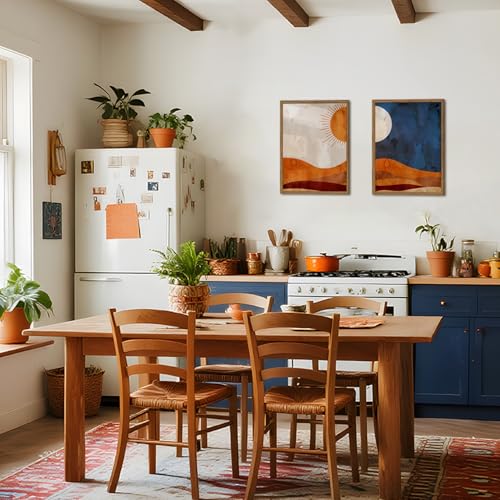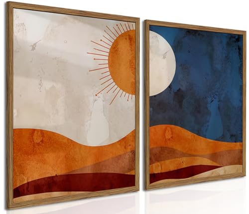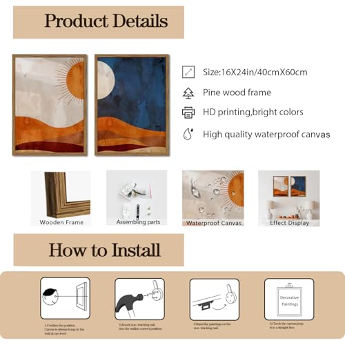 - 【Boho Sun and Moon Wall Art】 Framed canvas wall art set features sun and moon pictures prints with abstract desert mountains, blending boho style with vintage western influences. Warm tones and minimalist wall decor make this set a standout piece in room decor