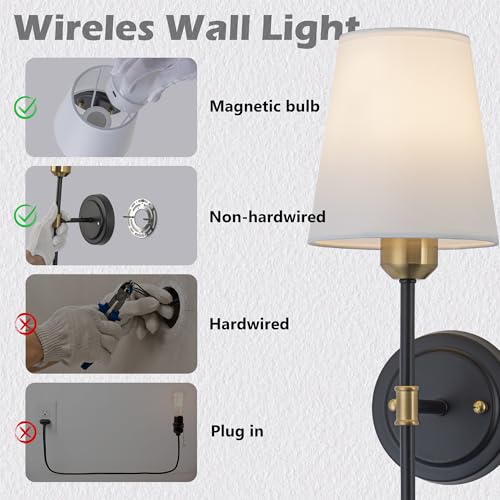 - 【Wireless & Easy to Install】Enjoy wire-free installation with this cordless battery operated wall sconce. Well-crafted fabric shade and adjustable metal frame offer directional lighting, suitable for lighting in various occasions. Mount it anywhere, free from outlet restrictions, and benefit from its emergency illumination during power outages.