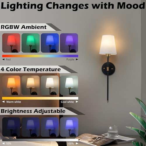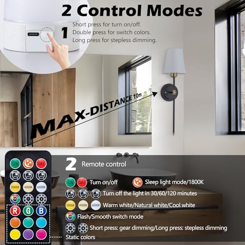 - 【RGBW & 4CCT with Dimming】This rechargeable wall sconce set of 2 come with two magnetic LED bulbs offering RGBW colors and 4 color temperatures. Enjoy 10%-100% dimming and two dynamic color-changing modes (Flash and Smooth mode). Paired with a stylish wireless sconce wall lighting it can effortlessly blend into any interior space, creating a cozy ambience.