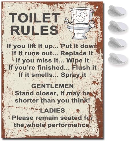 - Toilet Sign – Our Bathroom signs are an aluminium metal sign construction with a rustic but GLOSS finish, protecting them from steamy bathrooms and toilets. Your Bathroom Art will last for many many years, so the toilet rules sign will also be followed.