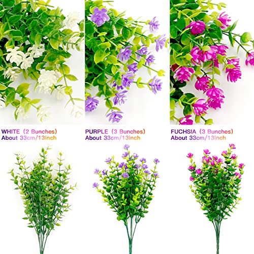- Package and Size: Package includes 3 bunches of purple plastic artificial flowers, 3 bunches of fuchsia plastic artificial flowers and 2 white bunches of plastic artificial flowers, 8 pieces in total. Each bunch of artificial flowers with 7 flexible stems and bushy green leaves with thick texture, completing a real look. Each artificial flower bouquet is approx. 33cm/13.18in high. (If a petal falls off, just put it back into the stem