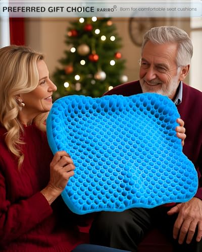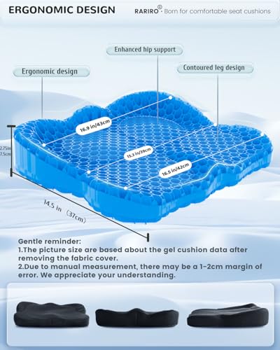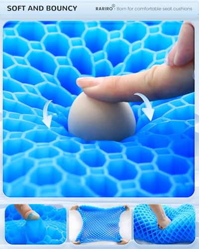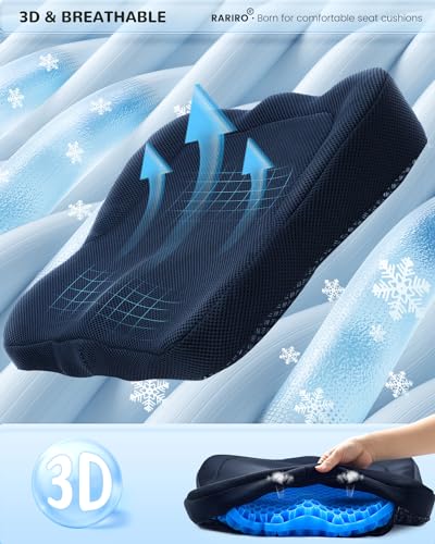 - 【REMOVE THE COVER FOR SOFTER USE.】The RARIRO latest upgraded gel seat cushion in 2025, features a 3D mould and an ergonomic structure. It adaptively deforms in accordance with the shape and pressure of the buttocks, conforming to the body's curves and offers superior soft and bouncy support for the buttocks. Farewell to the sweltering feeling of the buttocks after sitting for extended periods as well as the discomfort of the coccyx.