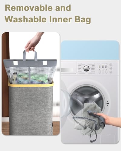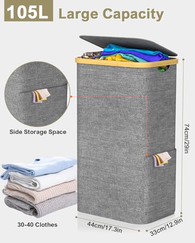 - Portable and Folding Design: Portable and spacious 105L folding laundry basket with sturdy frame, canvas sidewalls, detachable washable bag, and lid. Perfect for home and travel, it stands firm and folds easily for space-saving convenience
