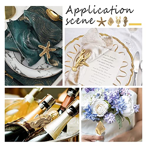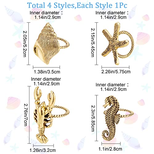 - 4 STYLES NAPKIN RINGS: Comes with 4pcs sea animals theme alloy napkin rings in 4 different shape decoration: shell, sea horse, shrimp, starfish, antique golden color, perfect to most occasions.
