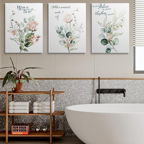 prinfantasy Green Bathroom Canvas Wall Art – Set of 3 Botanical Framed Poster Prints for Home Office 0710