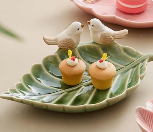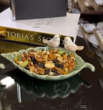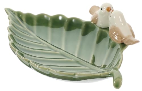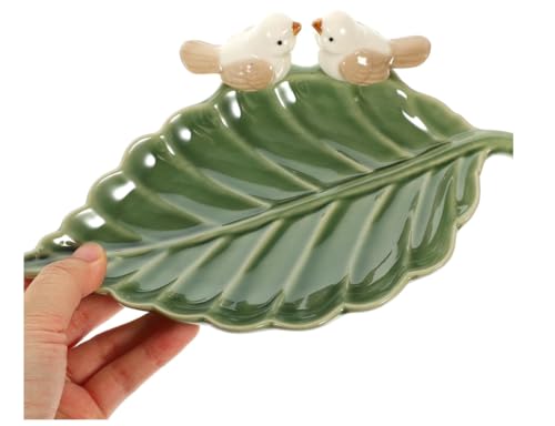 - Ceramic decorative tray in a unique green leaf shape with two charming bird figurines. Measuring 18 cm x 14 cm, this versatile dish is perfect for organising jewellery, keys, coins, or other small items.