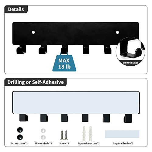 - 【Specification】Color: Matte Black. The size of the entire product is 9.65(L)x1.78(W)inches, and the maximum bearing weight: 22 lbs. . Single Hook Size: 0.67 (L) x0.62X (D) x 0.46(W) inches. The unique six right Angle hooks won't let your items slip off easily, and each hook can hold up to 18 pounds.