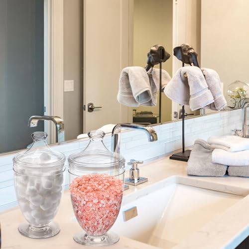 - Hacaroa 2 pack acrylic apothecary jars measure 9.6" H x 4.9" Diameter. Maximum Capacity: 46 fl oz when unlid, 42 fl oz when lidded. Suitable for candies, cookies, snacks, sugar, bath salts, cotton swab, cotton ball, etc.