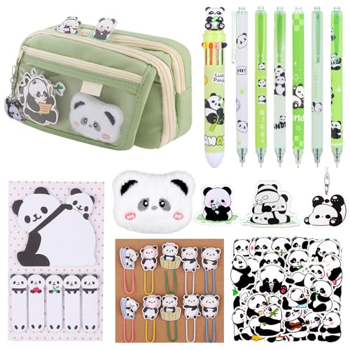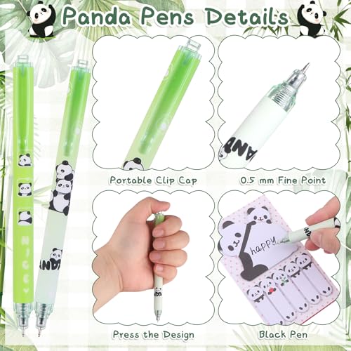 - 【Cute Panda Stationery Set】The cute panda school supplies include 1 green pen pouch,6 cute panda click pens(14*1 cm/5.5*0.4 inch), 1 ten-color ballpoint pen(15*2 cm/5.9*0.8 inch),1 panda sticky note(6.3*6.1 cm/2.5*2.4 inch),1 set of panda stickers, 2 sets of panda acrylic pins(4.2*3.3 cm/1.7*1.3 inch),and 1 panda acrylic keychain(12*8.5 cm/4.7*3.3 inch),10 paperclip bookmarks, 1 plush panda pins;a sufficient quantity of cleverly matched panda pens to meet your daily need,and you can share them with your friends and family.