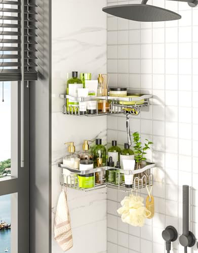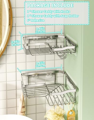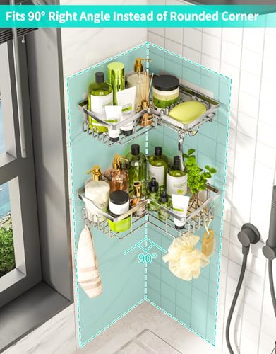 - [Super Capacity of Silver Shower Caddy]: L-shaped corner shower caddy, only suitable for 90° corners. 2 pack shower caddy with 11 hooks and shampoo holder, bathroom holder for shower provides enough space to storage daily products what you need in the bathroom or kitchen. The hooks under the soap holder of shower caddy corner also can be used to hang razor