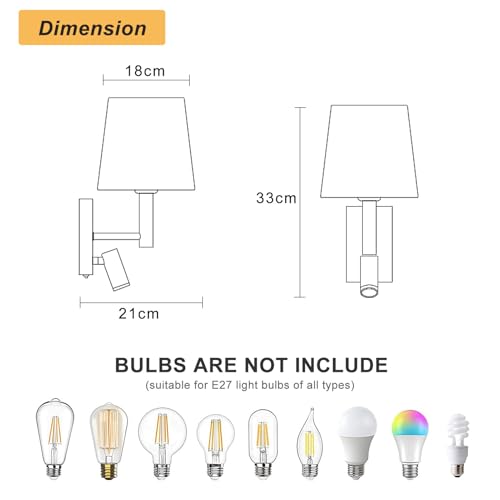 - Packaging includes: 1 x Wall light with adjustable reading light, 1 x Cylinder white fabric shade, 2 x Screws, 2 x Rawl plugs, installation guide