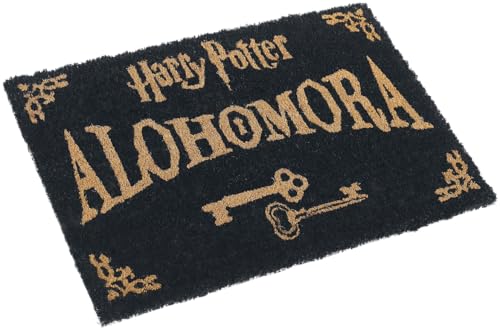 - Striking black and gold door mat featuring the official Harry Potter logo and "ALOHOMORA" unlocking spell