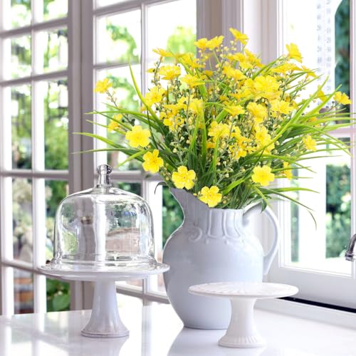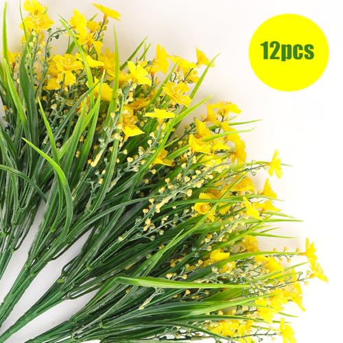 - 【Artifcial Flowers Set】Include 12 Bundles faux uv-resisitant flowers,each bouquet has 7 flexible stems and bushy leaves.The spring grass flowers are 14"High x 9"Wide approx,which add a full of vitality to your garden, kitchen,windowsill,living room,dining table.