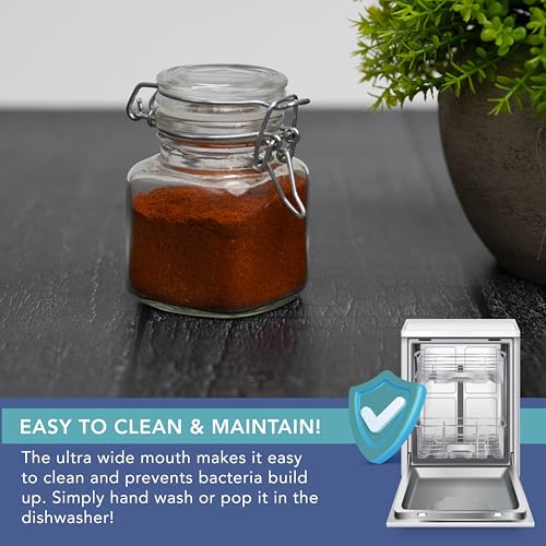 - PERFECT POUR CONTROL – These HEFTMAN small jars with lids are designed with a neck wide enough for a teaspoon, making measuring your ingredients easy and mess-free. Whether you're drizzling oils or adding spices, the controlled pour of these glass jars with clip lids ensures precision in your cooking.