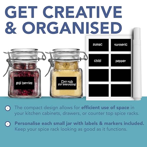 - CHIC AND CUSTOMISABLE – Add a touch of charm and quirkiness to your kitchen with the included black labels and chalk pen. Personalise each small jar to suit your style and keep your spice rack looking as good as it functions. The compact size of these glass spice jars with lids also makes them perfect for display, enhancing the aesthetic of your kitchen.