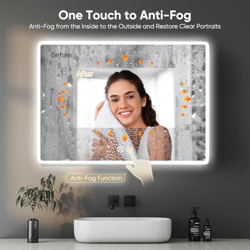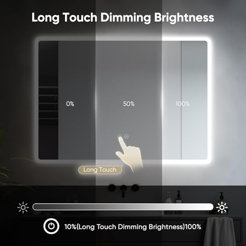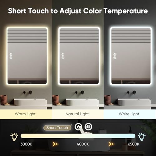 - 【3 Colors Dimmable Light & Memory Function】: Our LED bathroom mirror allows for easy brightness adjustment, which is controlled by the touch-sensor switch. You can switch between warm white, natural light, and cool white. Moreover, you can adjust the light brightness to a comfortable level. This bathroom LED mirror has a smart memory function, so it will retain the brightness settings you used last time.