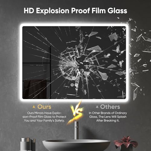 - 【Shatterproof HD Tempered Glass】: The illuminated bathroom mirror is made of HD tempered glass. Its mirror imaging is very realistic, with a CRI > 90Ra. Additionally, it is shatterproof, rustproof, and corrosion-resistant. The 4.5 mm tempered glass comes with an explosion-proof film, it is not easy to break, and even if it breaks, it will not shatter into pieces, safer to use. The LED strip has a lifespan of 50,000 hours.