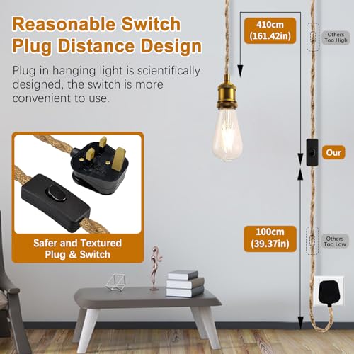 - Reasonable Switch Plug Distance – Easy to Switch: To enhance the safety of the vintage pendant lamp kit, our plugs and switches are made of more durable flame retardant materials. In order to enhance the texture, the plugs and switches also use more exquisite surface treatment technology. The distance between the plug and the switch is 100 cm, and the distance from the switch to the bulb socket is 410 cm. The design is scientific and reasonable, more convenient for you to use the switch
