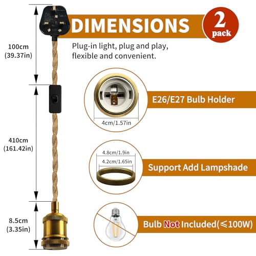 - 510 CM Extra Long Hemp Rope Cable – No Using Restriction: The cable of our plug in ceiling light has been lengthened to 510 cm, which is a solution to the inconvenience on the use of other 2 M and 4 M chandeliers. The hemp rope cable, with high strength and durability, can withstand greater tension and weight, making it easy to install all kinds of lampshades. It is also much softer and more flexible and can be easily wound and bent. There is also better insulation properties, safer to use