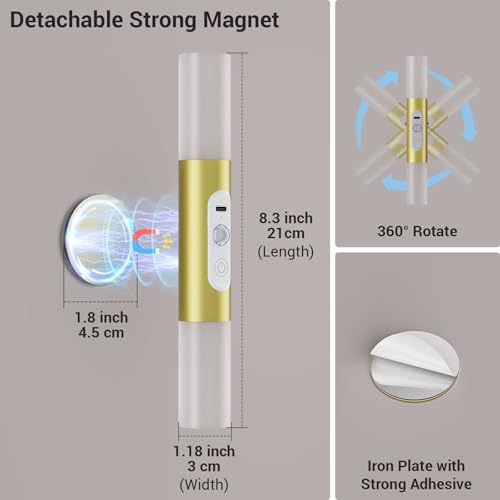 - Stick-on Installation and 360° Rotatable: Install the renter friendly battery wall sconce with strong adhesive and built-in strong magnet without destroying your wall, or attach it to any iron places directly. Non wire, No drill, Non hardwire and No screw