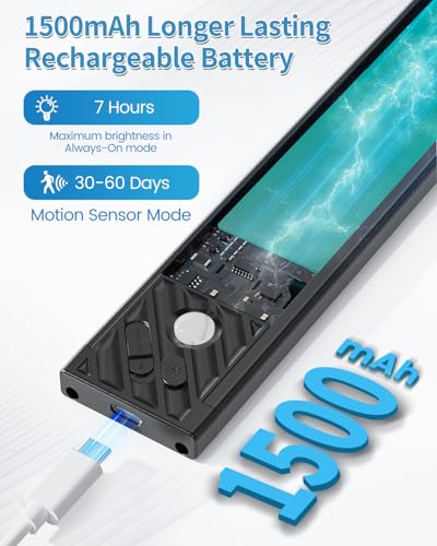 - 【1500mAh Long-Lasting Battery & USB-C Fast Charging】Powered by a high-capacity 1500mAh battery, our battery operated lights provide extended usage without frequent recharging. These motion senor cupboard lights support up to 7 hours in always-on mode or 7–30 days in sensor mode per charge. The USB-C port enables rapid charging in just 1-2 hours and allows continuous operation while charging, ensuring non-stop functionality wherever you need light.