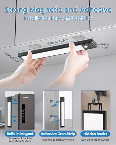 - 【Slim Magnetic, Adhesive & Hanging Design】With a strong magnetic base and reinforced adhesive tape, these under shelf lighting install in seconds—no drilling, wiring, or tools needed. It offers flexible placement on metal surfaces, wall, and shelves while maintaining a clean aesthetic. The discreet low-profile design blends seamlessly into wardrobe without disrupting aesthetics. A unique hidden hook offers additional mounting flexibility, making it easy to move and reuse across multiple spaces.