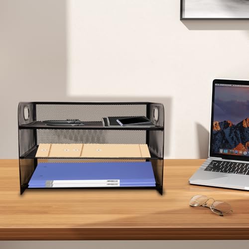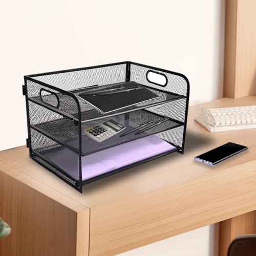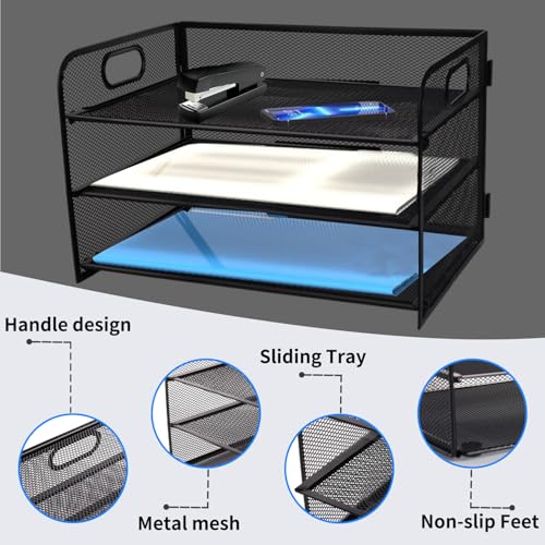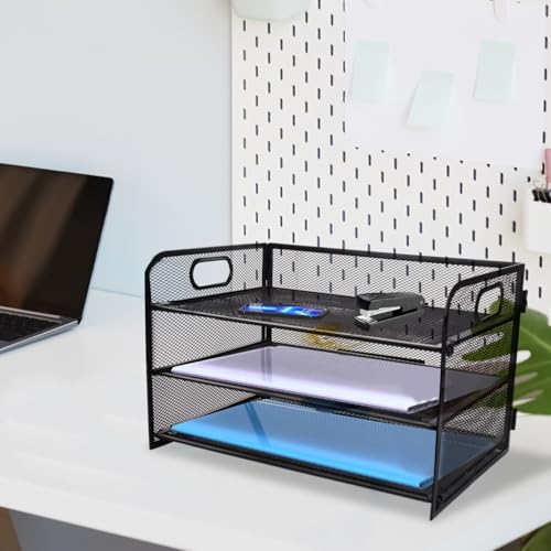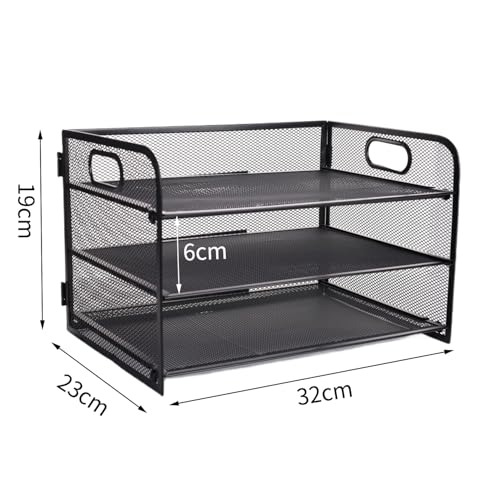 HMXLJJY 3 Tier Office Desk A4 Paper Letter Organiser Tray with Handle,Mesh Desk Organiser Letter Tray,Desktop Filing Document Trays Holders,File Storage Rack for A4 File Folder, Black