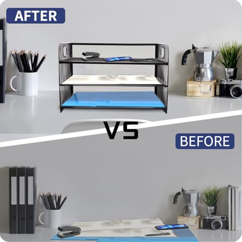 Upgraded desk organiser is 3 tier paper tray organizer. This paper organiser has 3 detachable trays which is perfect for holding letters, A4 paper, books, bills, magazines, mails, folders, notebooks and so on. The desk organisers can fully take advantage of your vertical space and keep your desktop clear and tidy.