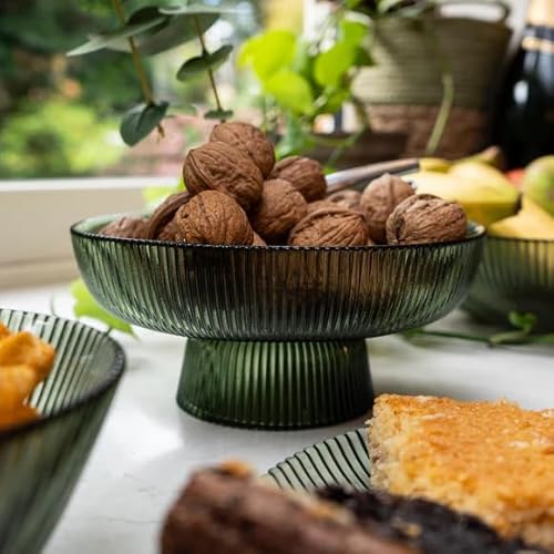 - Elegant Design: This 20cm ridged glass pedestal bowl features a striking olive green hue and ribbed texture for an eye-catching centrepiece. Dimensions 9cm x 20cm x 20cm