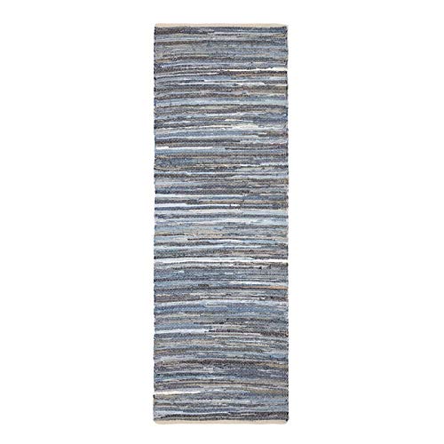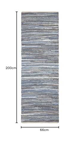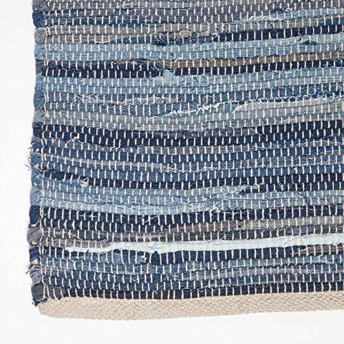 - Homescapes blue recycled denim rug, shades of blue rug woven from pieces of denim fabric made from 100% recycled cotton. This textured, hardwearing rug is available in various sizes including a hallway runner and a circular rug.