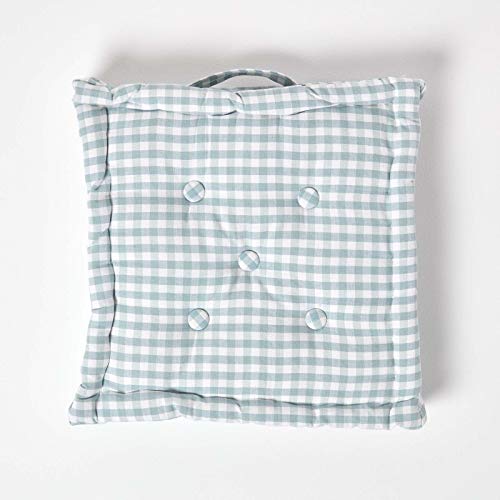 - Blue and white gingham check floor cushion for outdoor and indoor use, generously filled with a tufted and quilted design and carry handle. Size: 40 x 40 x 8 cm.