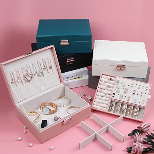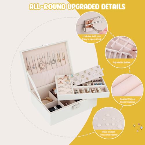 - [High Quality] Our jewellery case is made with premium PU leather which is durable, odorless, waterproof and moistureproof. The interior is made of high quality beaded flannel, it can keep your jewelry well protected against dust, fingerprints, scratches, and damages. What’s more, the box was equipped with a lock button and a small key to keep your valuable jewelleries safe.