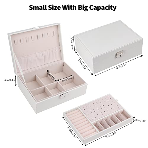 - [Large Capacity] The jewellery organiser size is 9.02* 6.77* 3.35 inch, featured with double layers which can provides 8 necklace hooks, 2 ear stud cards for a total of 74 earring holes and 15 earring clips, 10 ring rolls and some adjustable storage space that can save lots of space to make your room looks more neatly and comfortable.