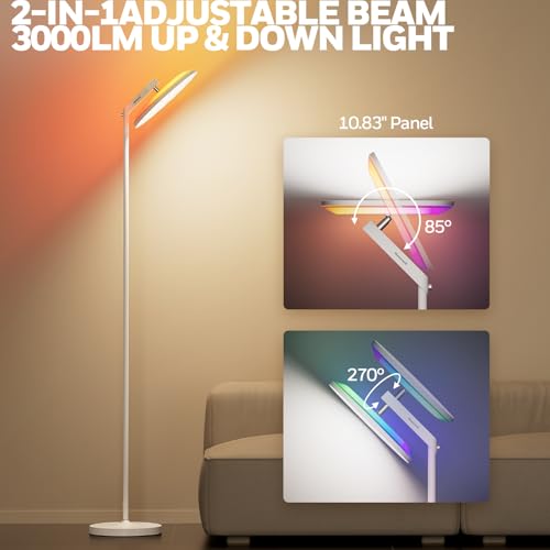 - [2-in-1 Manual Up/Down Lighting]: Straight Up for Room-Filling Light: floor lamps for living room Stand it tall for a brilliant torchiere effect that bounces soft, ambient light off your ceiling, led floor lamp lighting up your whole room evenly – perfect for relaxing or entertaining. (Ditch the overhead light!), Bend It Down for Work & Relaxation: Easily bend the pole to transform it into a focused downlight, ideal for reading your favorite book, getting work done, or crafting without straining your eyes.the lamp head tilts from 85° to 270° for multiple angles