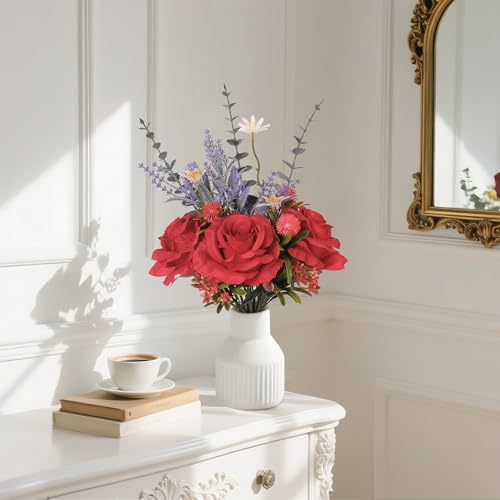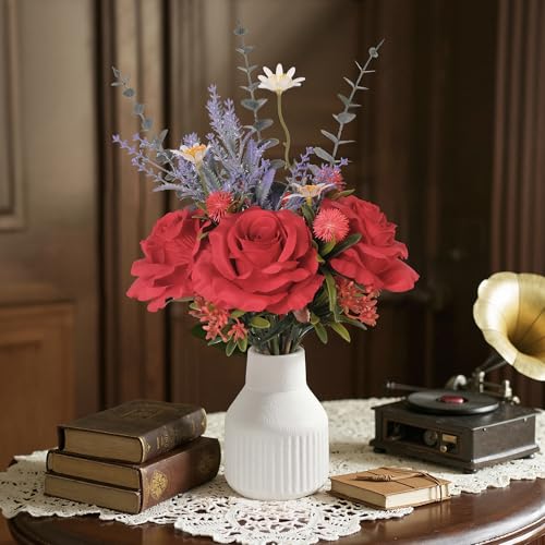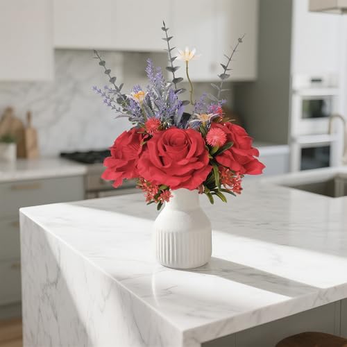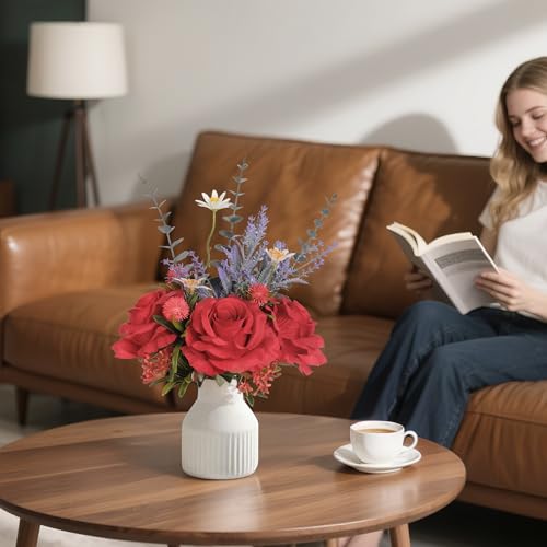 - Lifelike & Stylish Design – This beautiful faux flower arrangement features silk roses, eucalyptus, lavender, and daisies in a white ceramic vase. Perfect as a dining table centrepiece, coffee table decor, or floral centrepiece for tables, adding a touch of rustic farmhouse charm to your home.