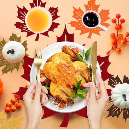 - 【Autumn Themed Design】 The fall placemats coasters sets feature five different colors of maple leaf designs, each piece shaped is a maple leaf, precision cut with exquisite patterns, perfect for complementing your Thanksgiving, fall, or autumn decorations. Each placemat measures 34 x 33 cm / 13.38 x 12.99 inches, and each coaster measures 13 x 13 cm / 5.12 x 5.12 inches, suitable for most plate or cup sizes.