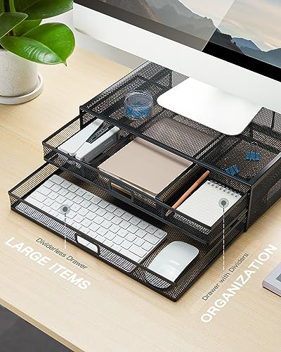 - Perfect Desk Organizer – With the size of 40.1cm (L) x 30cm (W) x 11.4 cm (H), the office accessories can fit papers or documents in the bottom drawer and the top drawer has dividers for smaller items, which stores cellphones, pens, staplers, post-it notes and other office supplies. The simple hollow-out design allows you to see the stored items at a glance without worrying about missing small items. Perfect for optimizing desk space.