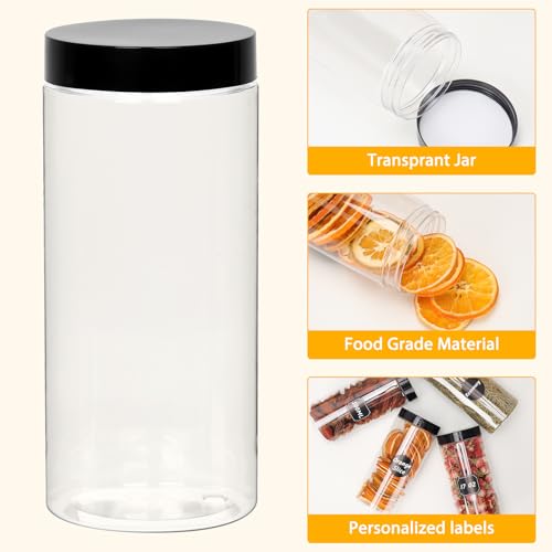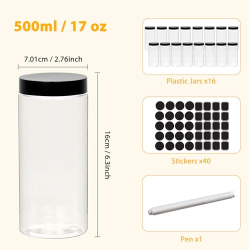 - 【Value Package and Service】Come with 16 pack 16oz clear plastic jars with lids +16pcs stickers + 1pen. These clear plastic containers consist of transparent PET plastic and a black plastic lid. They are stackable for making space-saving in your home & kitchen. If you have any questions or usage problems about our plastic jars, please contact us, we will reply to your message within 24 hours.
