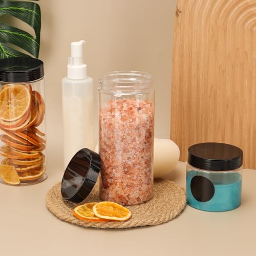 - 【Versatile Plastic Jars】Our cylindrical plastic jars with lids are 16oz, this perfect capacity is suitable for kitchen ingredients such as spices, dry foods, coffee beans, coffee powder, salt, sugar, peanut butter, honey, jam, snacks, dog food. Transfer creams, gels or serums from wholesale bottles or homemade batches into these presentable and convenient round clear plastic jars with labels. Whether in the kitchen or other storage, these clear plastic containers bottles are very suitable.