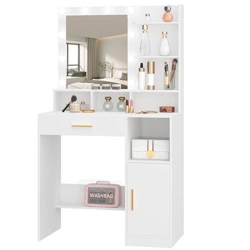 ![<ul><li>[Brightness Adjustable Lights] Hzuaneri dressing table comes with 10 light bulbs to provide super bright lighting conditions for you to feel the makeup environment of a high-end makeup room. The brightness of the lamp is adjustable, so you can choose the brightness to suit your needs.</li><li>[Large Storage Capacity] The dressing table set with 3 open shelves, 4 compartments, 1 drawer and storage cabinet provides enough space for your makeups, jewelry and other decorations. In addition, the bottom support panel of the dresser adds storage dividers for bags.</li><li>[Modern Unique Design] Simple and atmospheric white plate with high-grade gold handles to meet the high quality needs of consumers and add magic and fashion charm to your room</li><li>[Easy Assemble] We provide detailed, step-by-step assembly instructions and numbered accessories, so just follow the steps and trust your hands, you'll have an elegant vanity table set.</li><li>[Gift Idea] The charming dressing table with elegant design reinvents your home with a warm charm, combines function and beauty, contributes both fashion and practicality to your bedroom, will be an ideal gift for your girlfriend, wife, or daughter on special days.</li></ul> Hzuaneri Dressing Table with Mirror and 10 LED Lights, Vanity Table, Makeup Vanity with 3 Shelves & 4 Open Compartments, Large Drawer & Cabinet, Adjustable Lighting Brightness, White VT08103XUK - Cosy Home Interiors](https://www.cosyhomeinteriors.com/wp-content/themes/mediacenter/assets/images/blank.gif)
