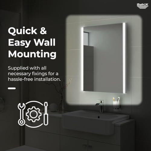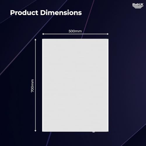 - WHAT’S INCLUDED & PRODUCT DIMENSIONS: Each box includes 1 x iBathUK Aurora 500 x 700mm battery operated led mirror, wall fixings, and user instructions. Dimensions: H70 x W50 x D3 cm. The mirror comes pre-assembled and ready to use with an aluminium frame and dual LED light strips. Backed by a 1-year manufacturer’s Guarantee for added peace of mind.