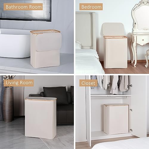 - 【Laundry Basket with Lid and Bamboo Handle】The washing basket is designed with oxford fabric and bamboo handles. At the same time, there are 4 detachable support rods for fixing the laundry basket, making the laundry basket more stable and upright, and you can easily assemble or fold the laundry basket. The thick linen and bamboo handles are durable and won't break easily, the bamboo handles won't rust, are lightweight, and the fabric is breathable for easy cleaning.