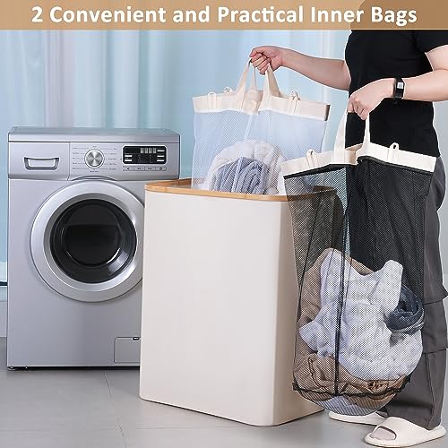 - 【Detachable inner bag】 This double laundry basket has 2 removable and washable inner bags, which is convenient to distinguish between dark and light-colored clothes or clothes and pants, etc. The mesh-designed inner bag is very easy to clean and disassemble, and there is no need to wash the laundry basket frequently. You don't need to move the whole laundry basket when you do laundry, and it is convenient to take clothes. It is suitable for pregnant women, the elderly, and children.