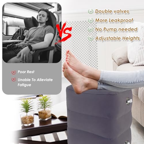 - 【3 Layer Height Adjustable】This inflatable airplane foot rest features 3 layer height adjustable that is easy to use. and three sizes can meet your different height requirements. Inflatable foot pedals can improve blood circulation and reduce leg swelling by elevating the legs. Helping you and your kids get better rest on the go,in relieving back pain since sitting for long period of time.