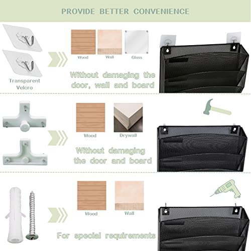 - Convenient: Wall organiser allows you to reach the contents easily, good for paperwork to organise your. Wall mounted document holder comes with mounting screws and transparent velcro that it can be easily mounted on the wall or board(such as:door cabinet, etc.)