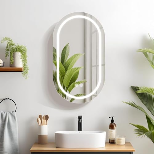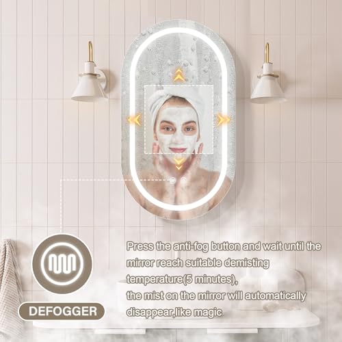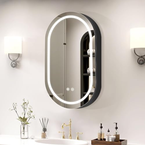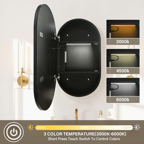 - [Smooth soft closing Hinges]The capsule shaped mirror cabinet with light equipped with premium soft closing hinges, the medicine cabinet door opens and closes silently and effortlessly, preventing slamming while providing a sleek, modern look.