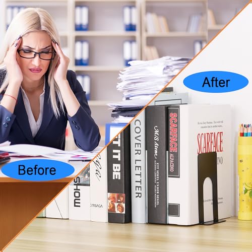 - 📚【Sturdy Anti-Rust Material】The book end made of sturdy metal with advanced technology, long lasting and durable, strong enough to hold large and heavy books neatly and upright, and hard to bend. High-quality powder-coated surface and round edges make sure that your shelves or books don’t get any scratches or scuff marks.