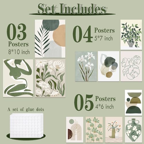 - Wall Art Decor Set include: Includes 3pcs 8"x10", 4pcs 5"x7", and 5pcs 4"x6" prints featuring sage green pictures, sage green prints, green posters, and sage green wall prints. Also includes green abstract wall art, olive green wall decor, and matisse wall art prints for a stylish touch.